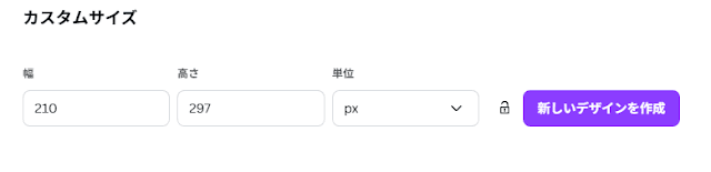 2.幅は「210」、高さは「297」、と空欄ボックスに手入力し、単位については「px」を選択してください。