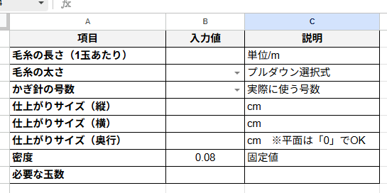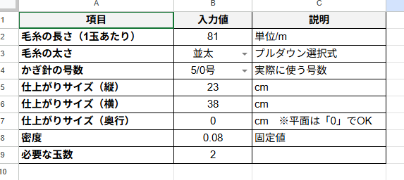 | かぎ針の号数 | 使用する号数を入力。こちらもプルダウン対応 |